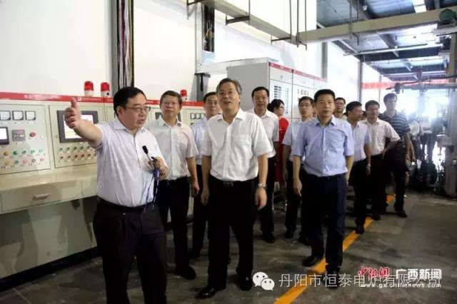 参加揭牌仪式的领导参观石墨烯三维构造粉体材料专用制备炉。广西大学可再生能源材料协同创新中心主任、广西石墨烯研究院首席科学家沈培康现场讲解介绍。
